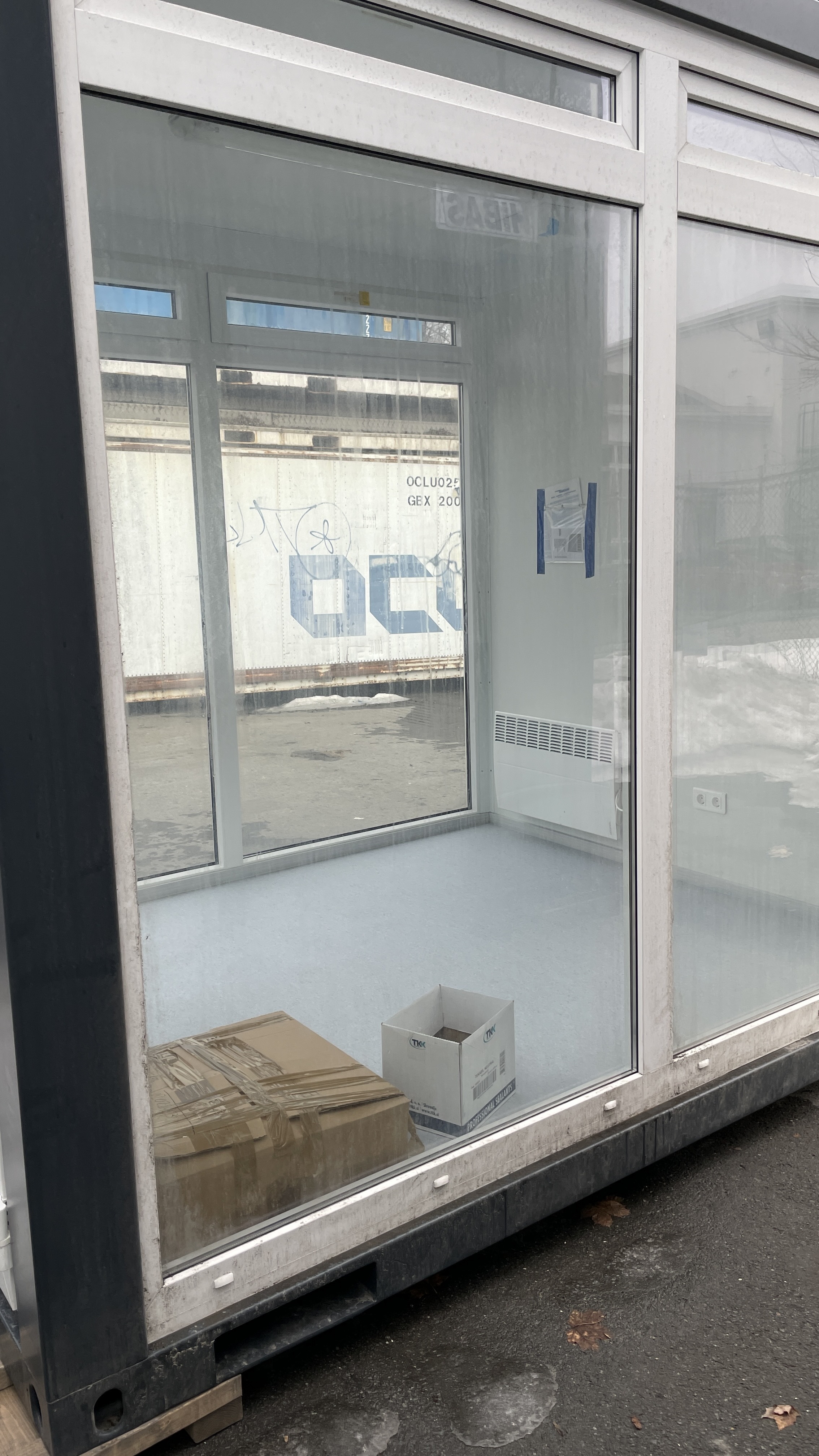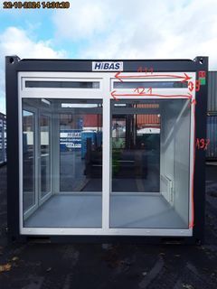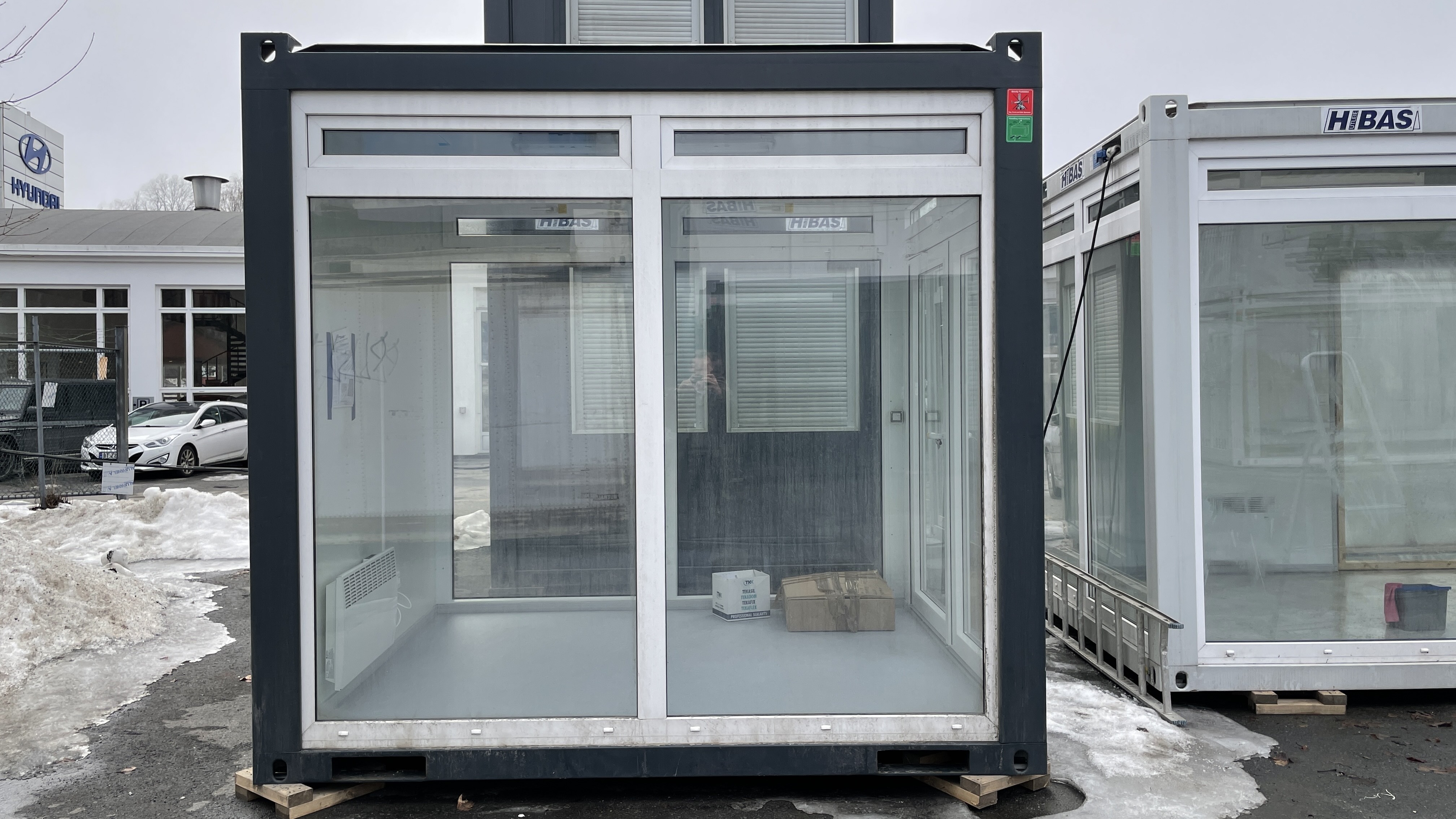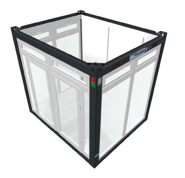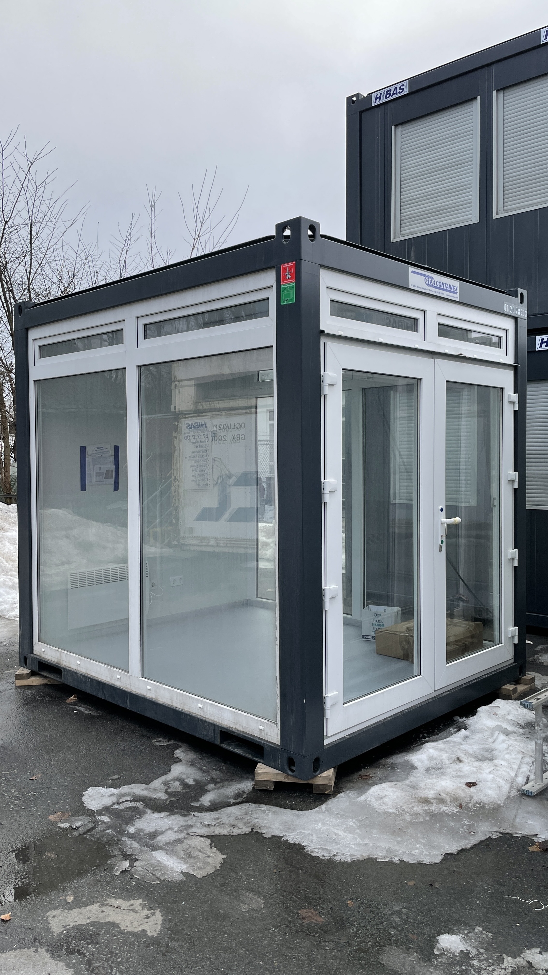 GC-1-10-NEX Frittstående showroom-container på 10 fot med glassvegger. Gir god synlighet og egner seg for salgsvisning, vareeksponering og pop-up-løsninger på byggeplasser, arrangementer og messer.