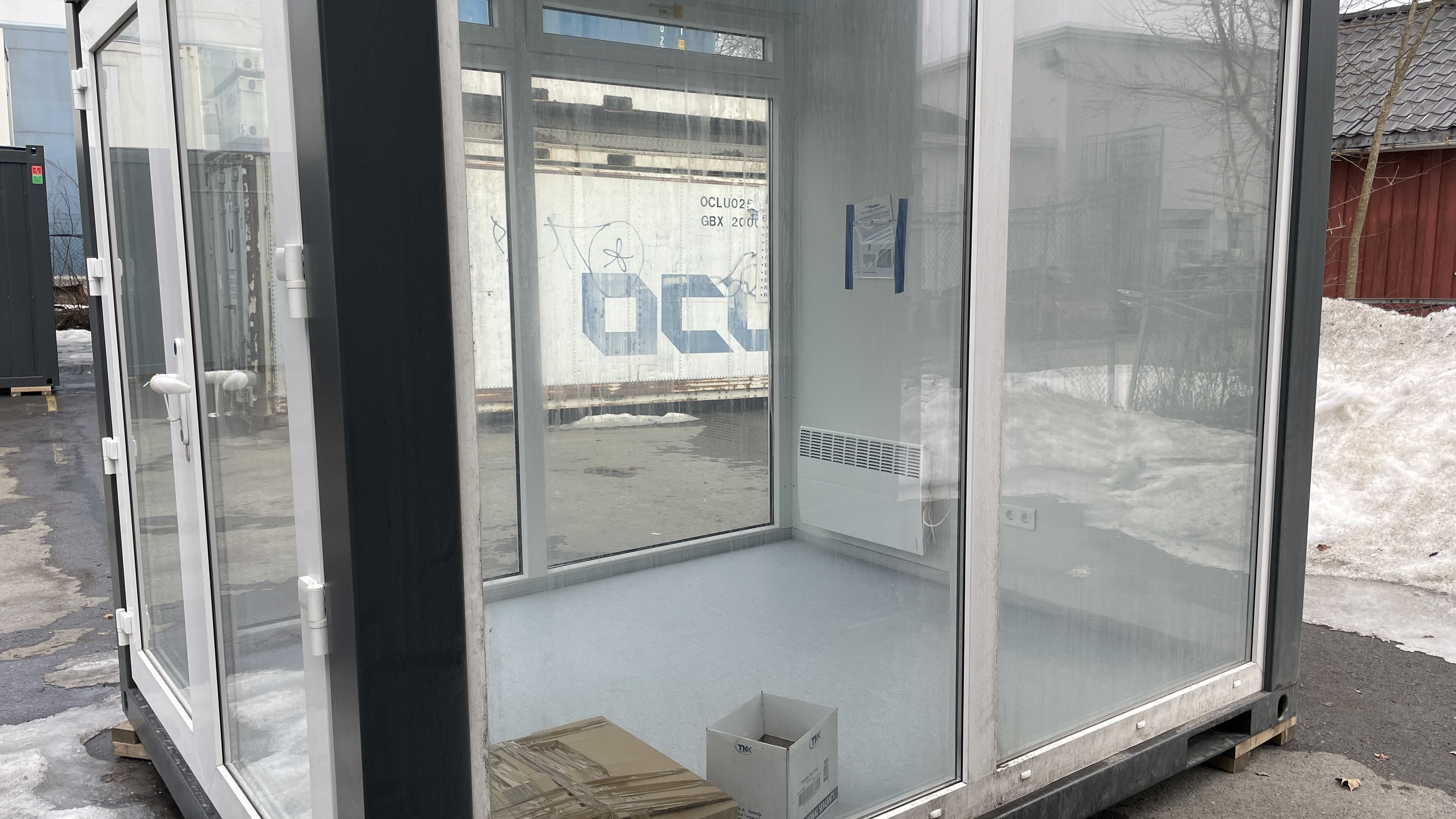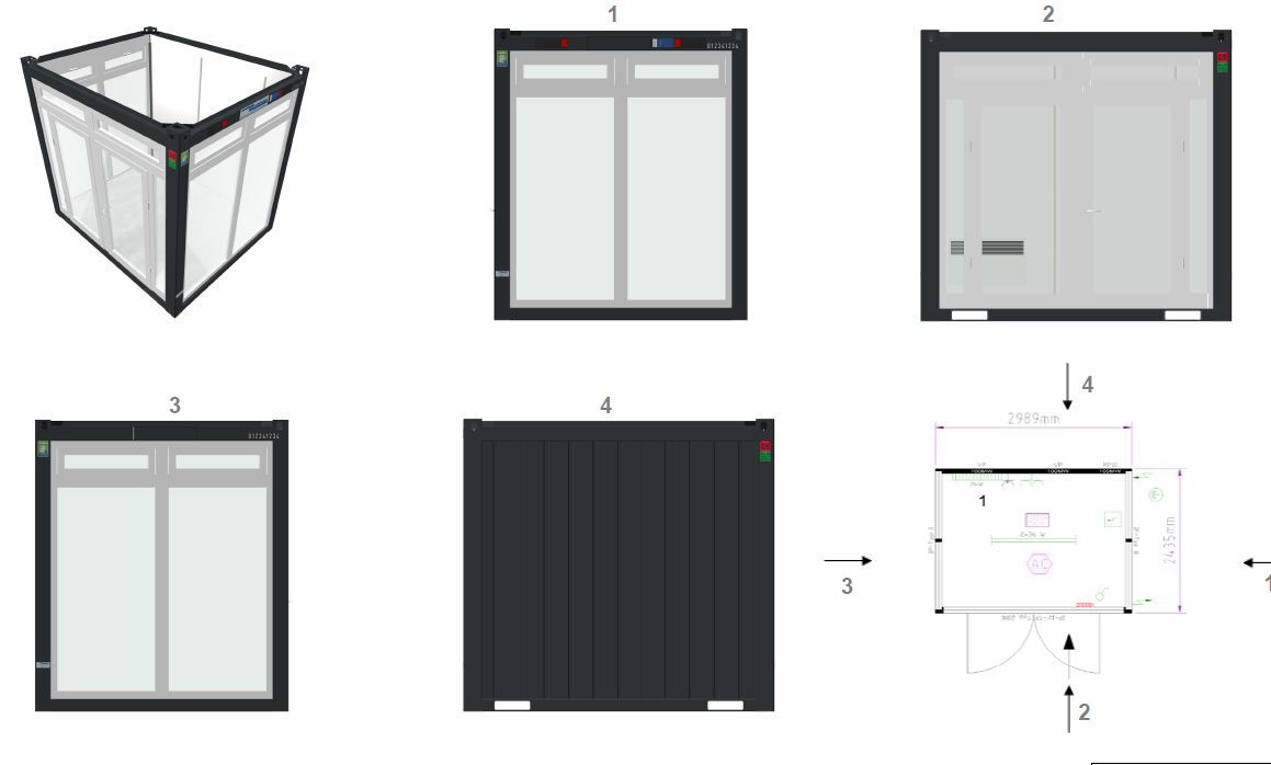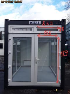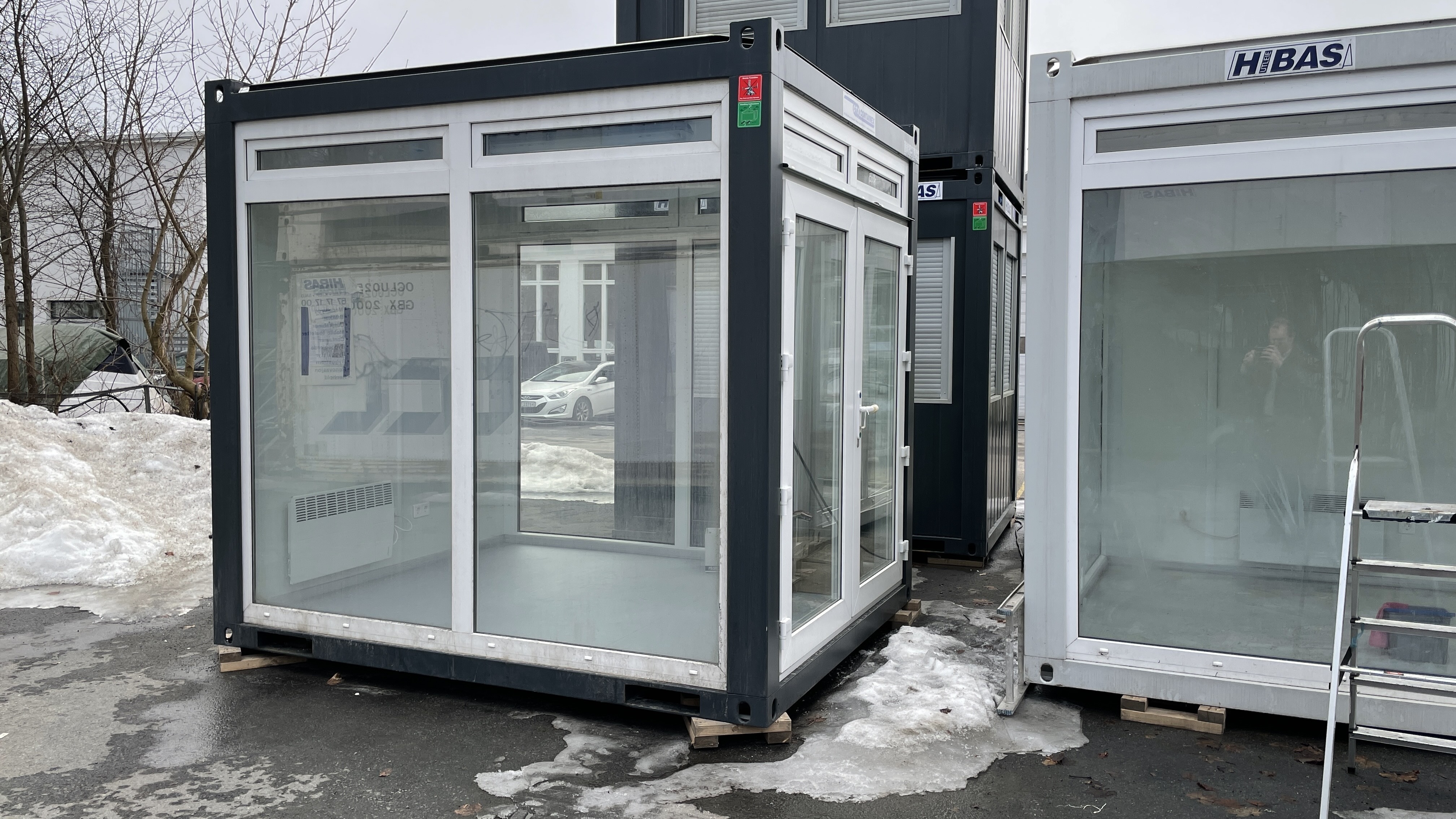 GC-1-10-NEX Frittstående showroom-container på 10 fot med glassvegger. Gir god synlighet og egner seg for salgsvisning, vareeksponering og pop-up-løsninger på byggeplasser, arrangementer og messer.