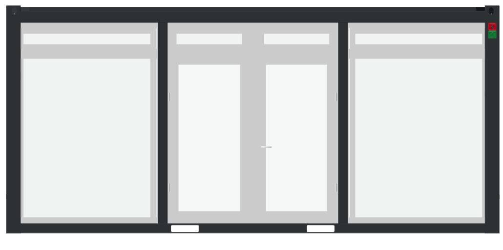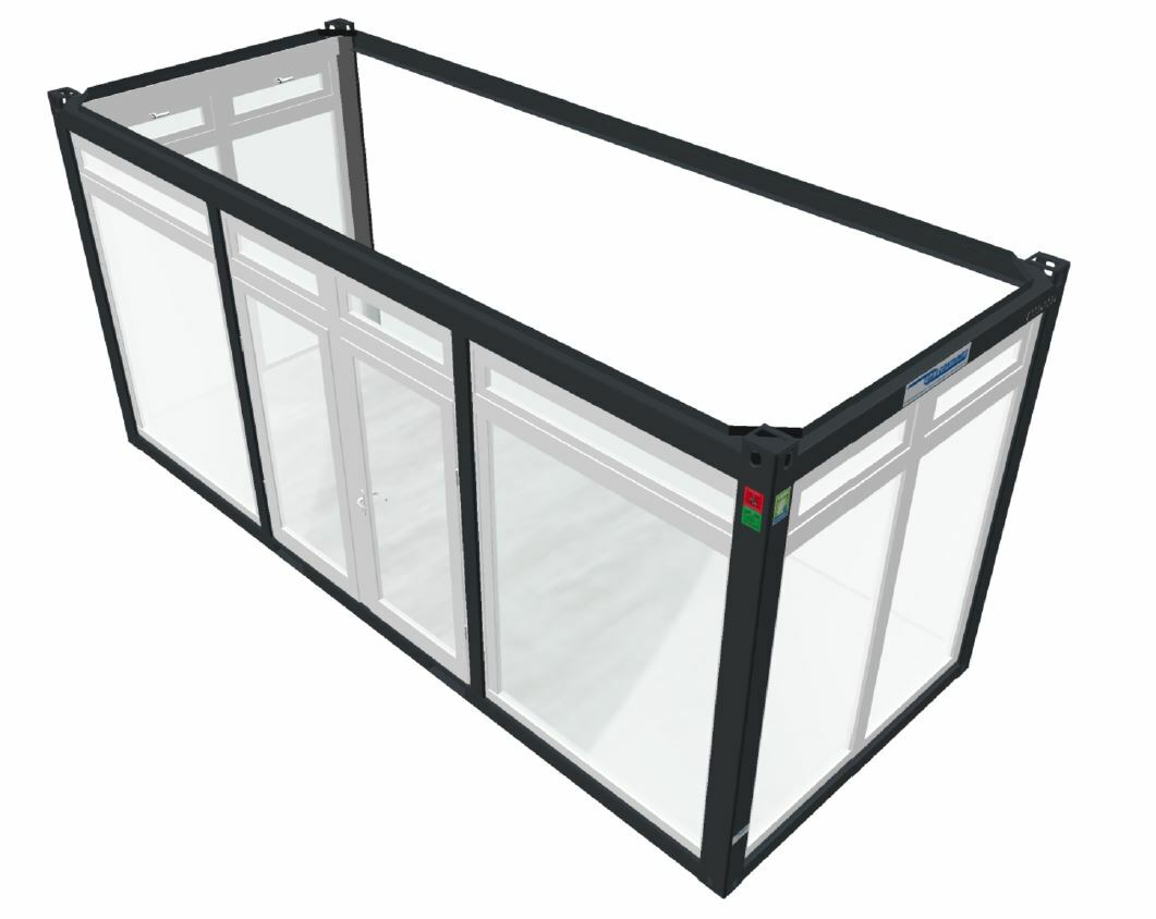 GC-5F-20-NEX Frontmodul til showroom-container på 20 fot med glassfront for god synlighet innvendig. Egnet for handel, arrangementer og midlertidig utstillingsrom.