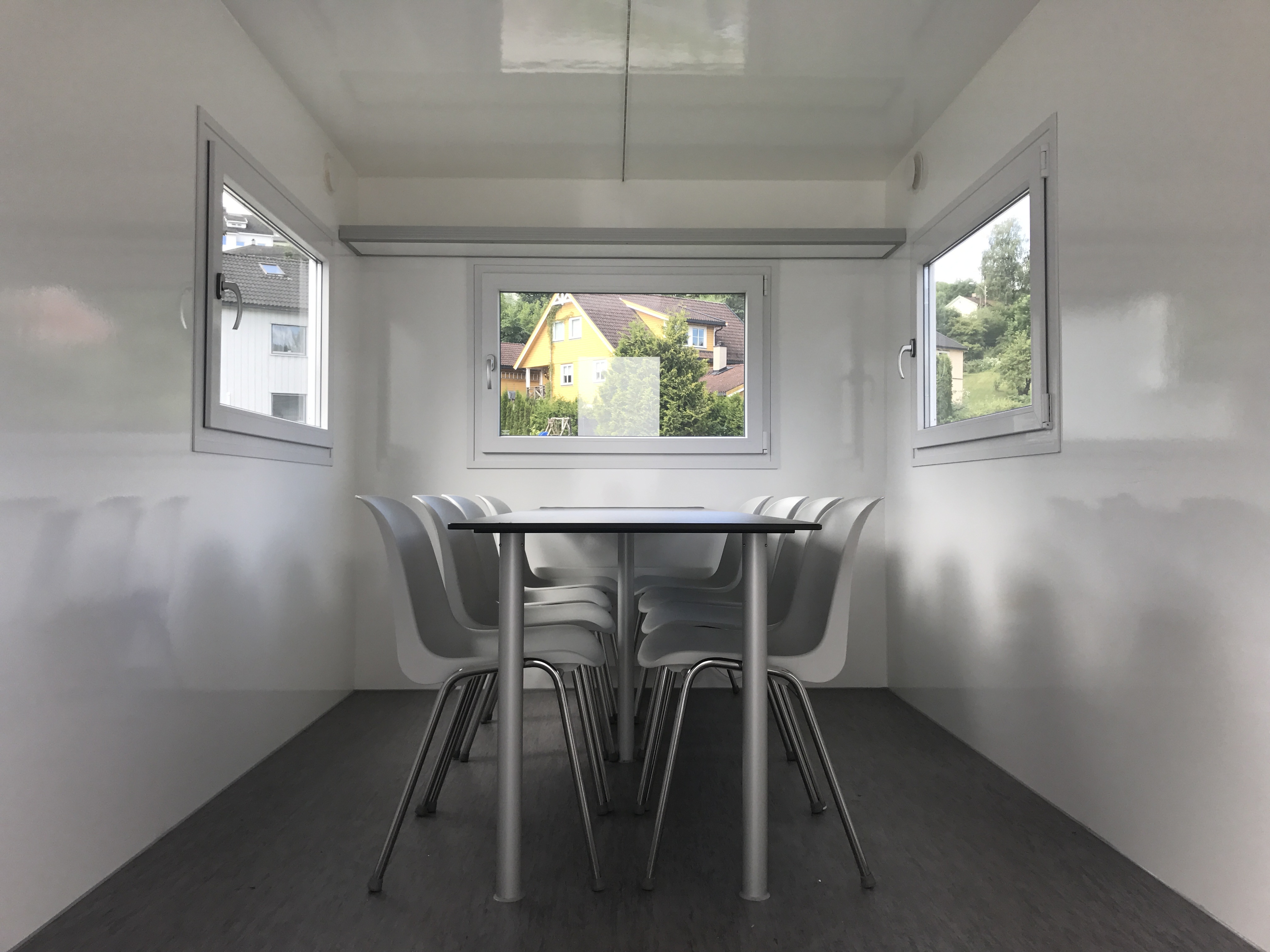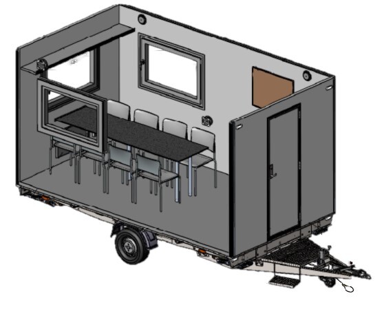 PV-8-420-SV Mobil mannskapsvogn for 8 personer med lukket konstruksjon. Fungerer som oppholdsrom og pauseområde. Montert på trekkbar tilhenger for enkel transport. Egnet for byggeplasser og arrangementer.