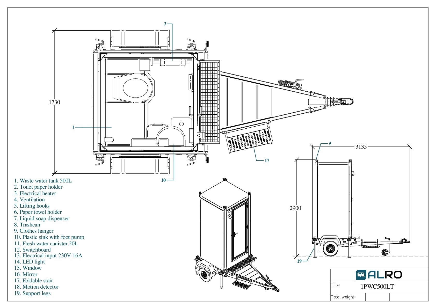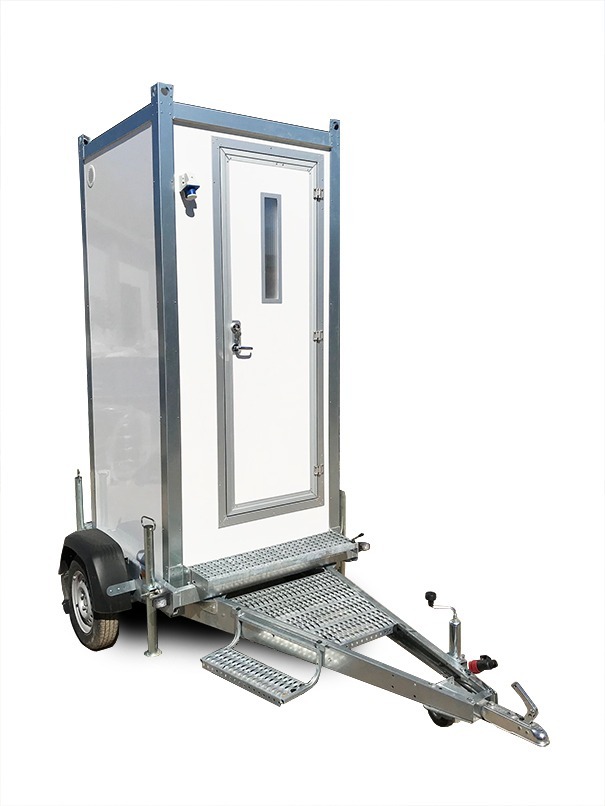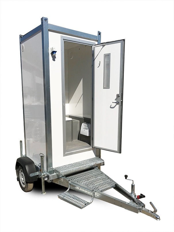 TCV-5-ALR Isolert toalettkabin på hjul med toalett, vaskeservant og varmesystem. Utstyrt med hengerfeste for enkel transport. Egnet for byggeplasser og arrangementer uten fast sanitærinfrastruktur.