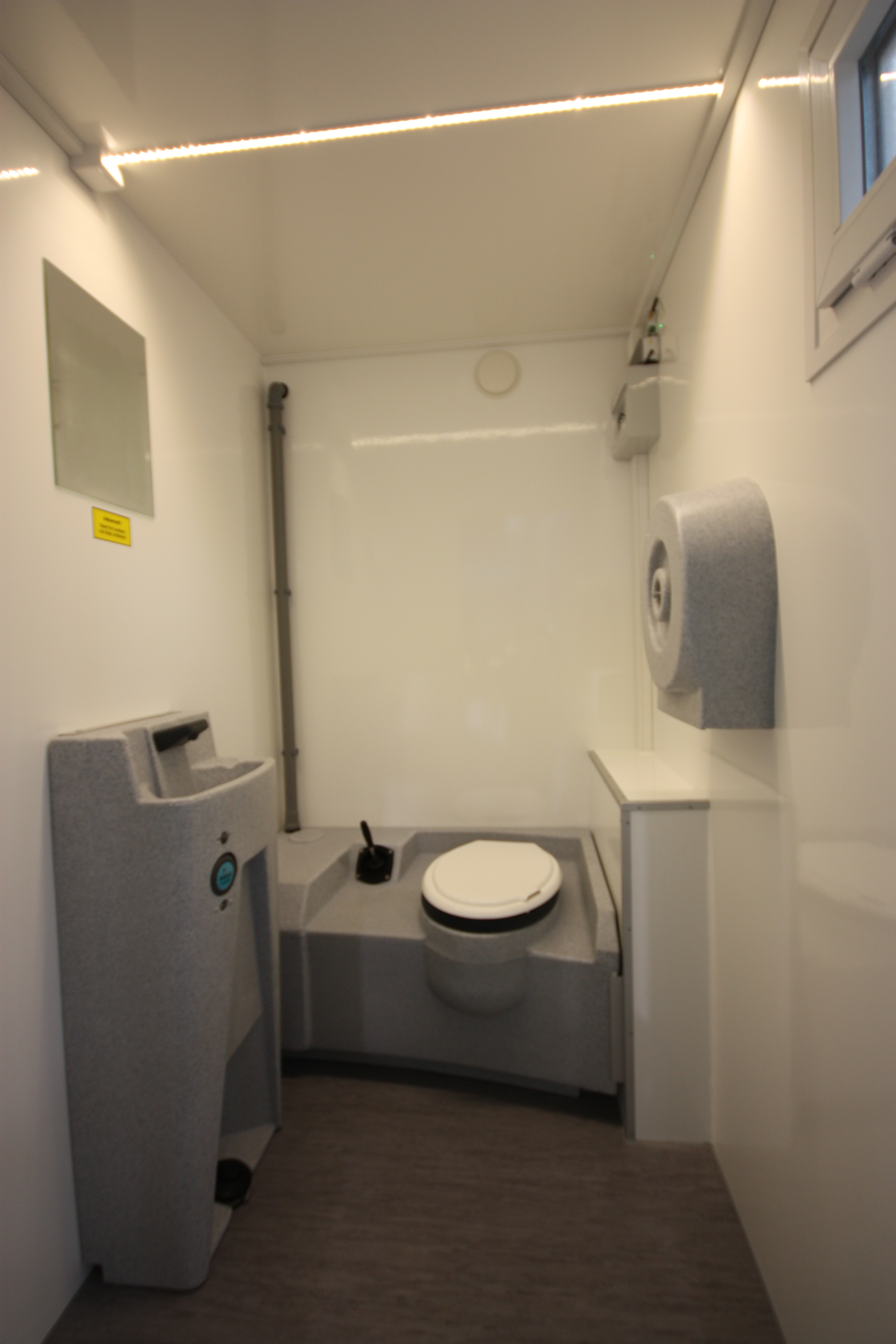 TV-TC2-240-SV Kompakt toalettvogn med 2 tanktoaletter på hjul. Utstyrt med vaskeservant, speil og LED-belysning. Egnet for mindre arrangementer og byggeplasser.