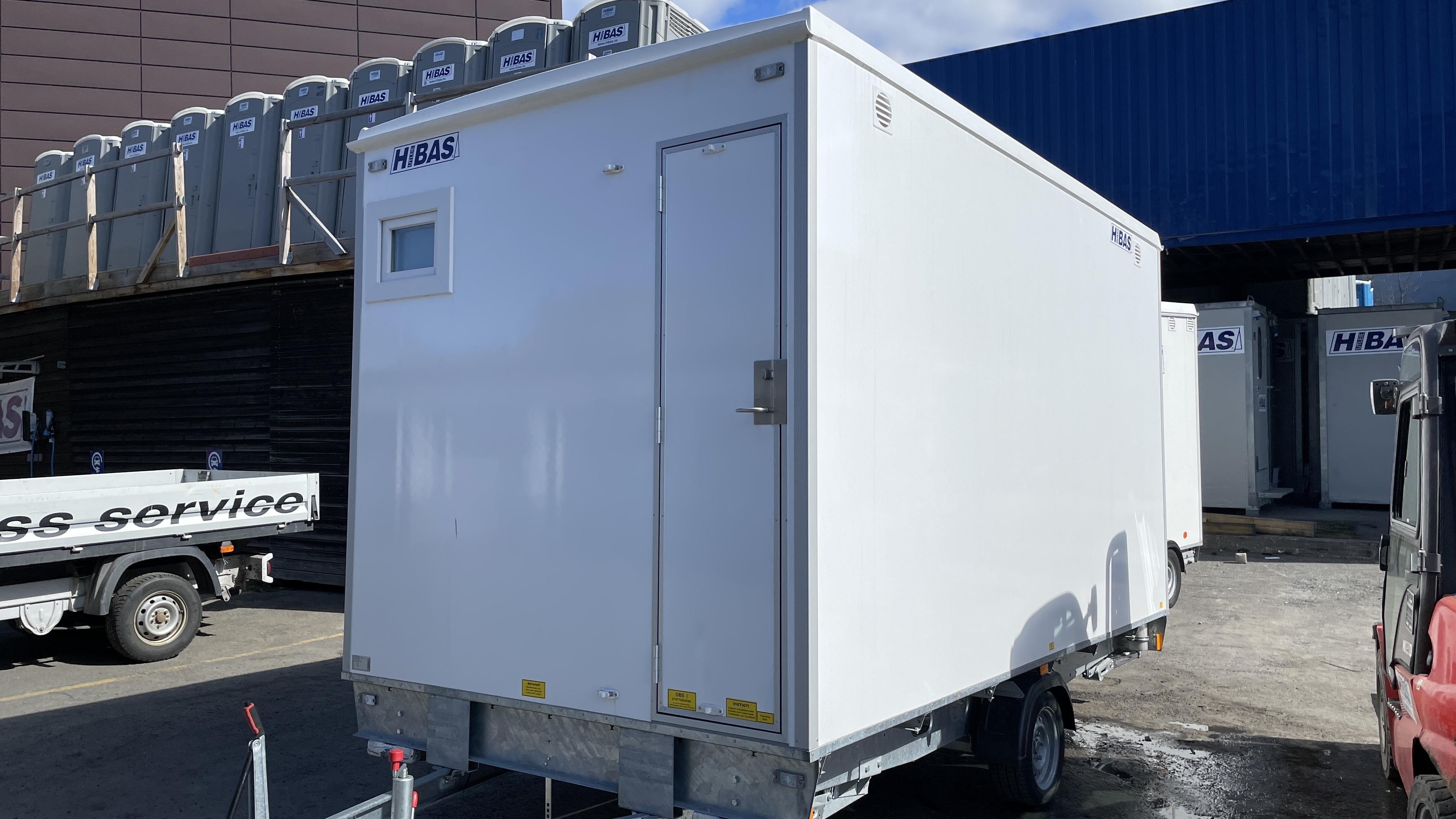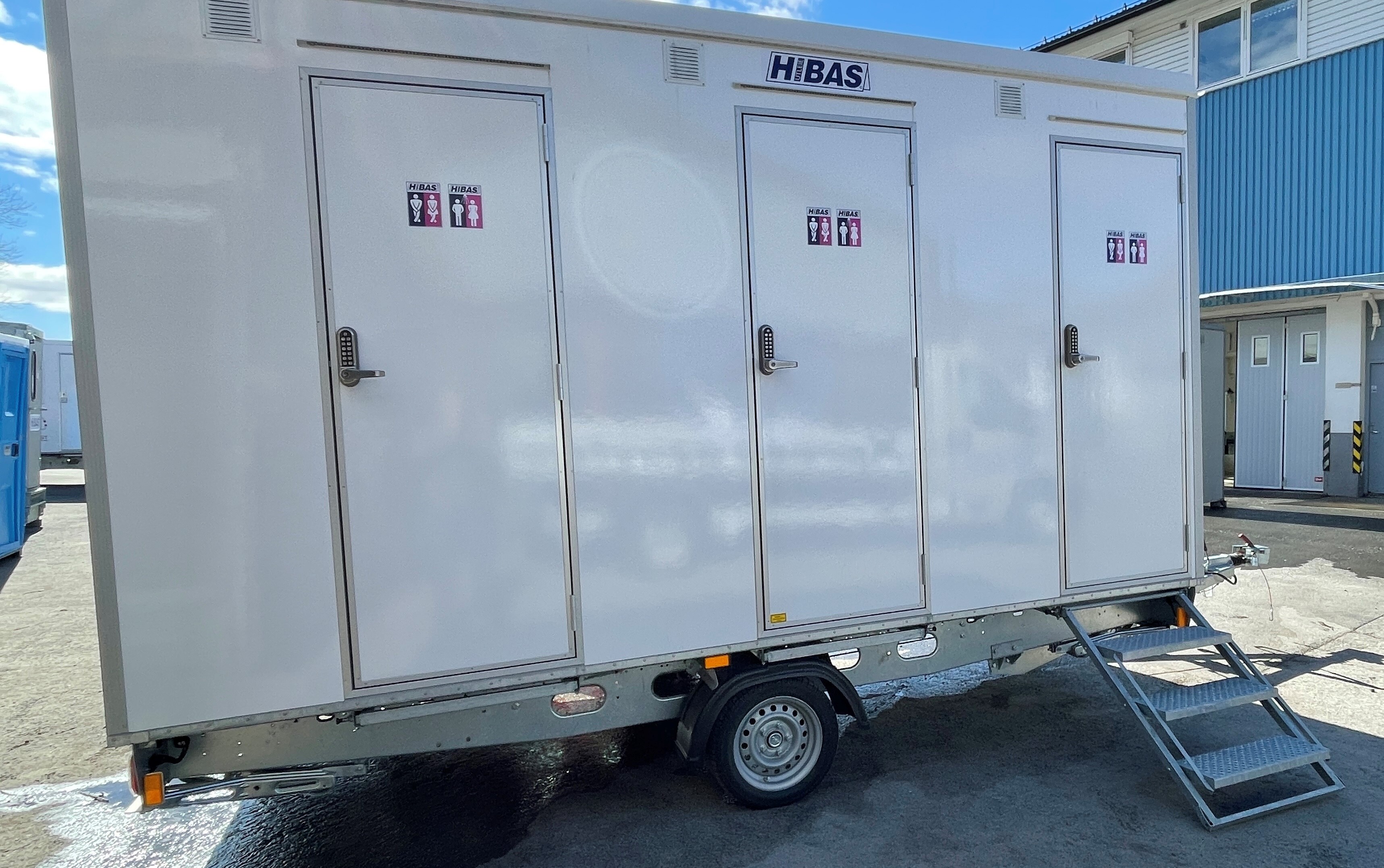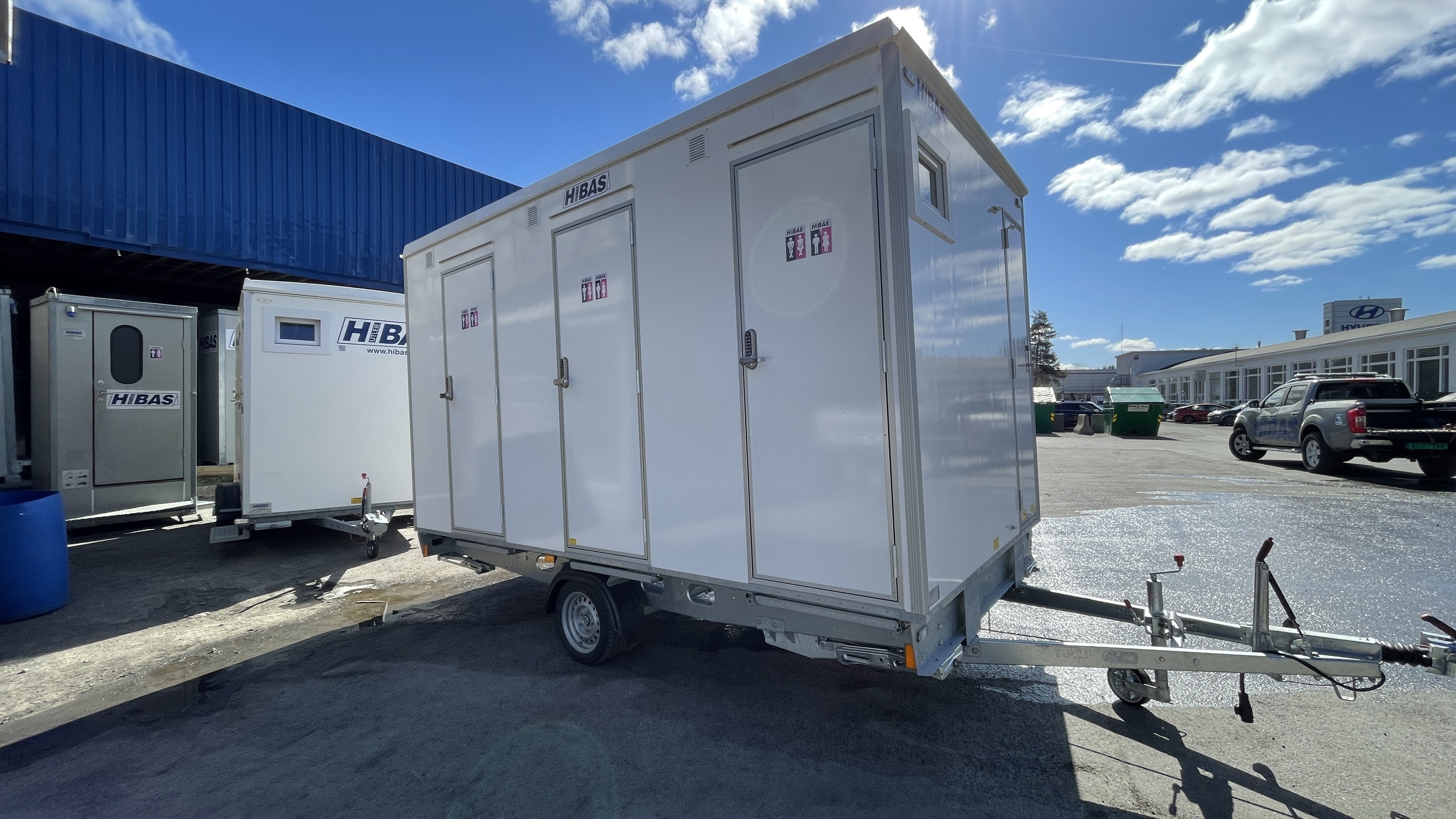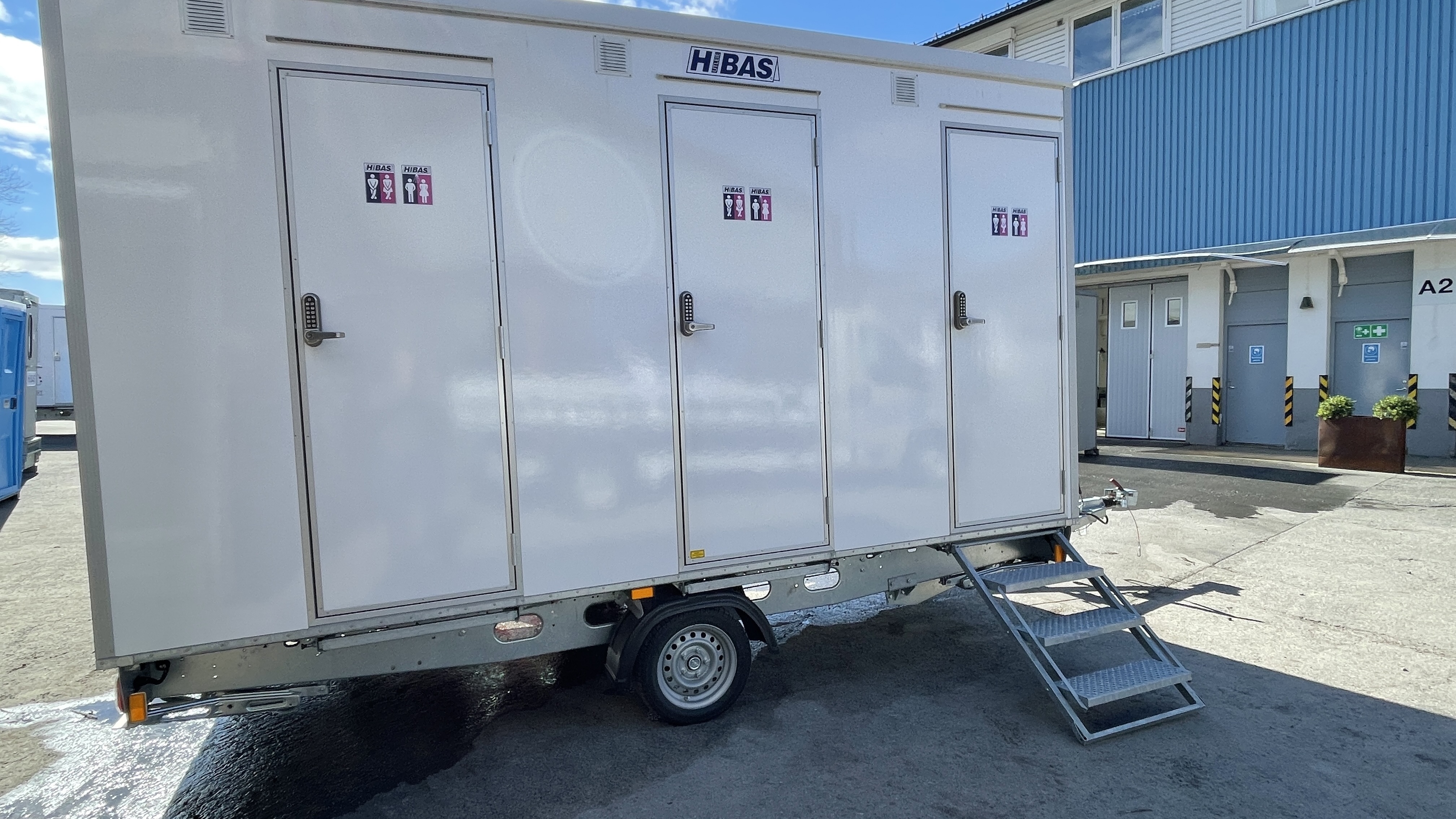Toalettvogn med 4 separate VIP-tanktoaletter. Montert på hjul for enkel transport. Utstyrt med moderne sanitærfasiliteter.… les mer