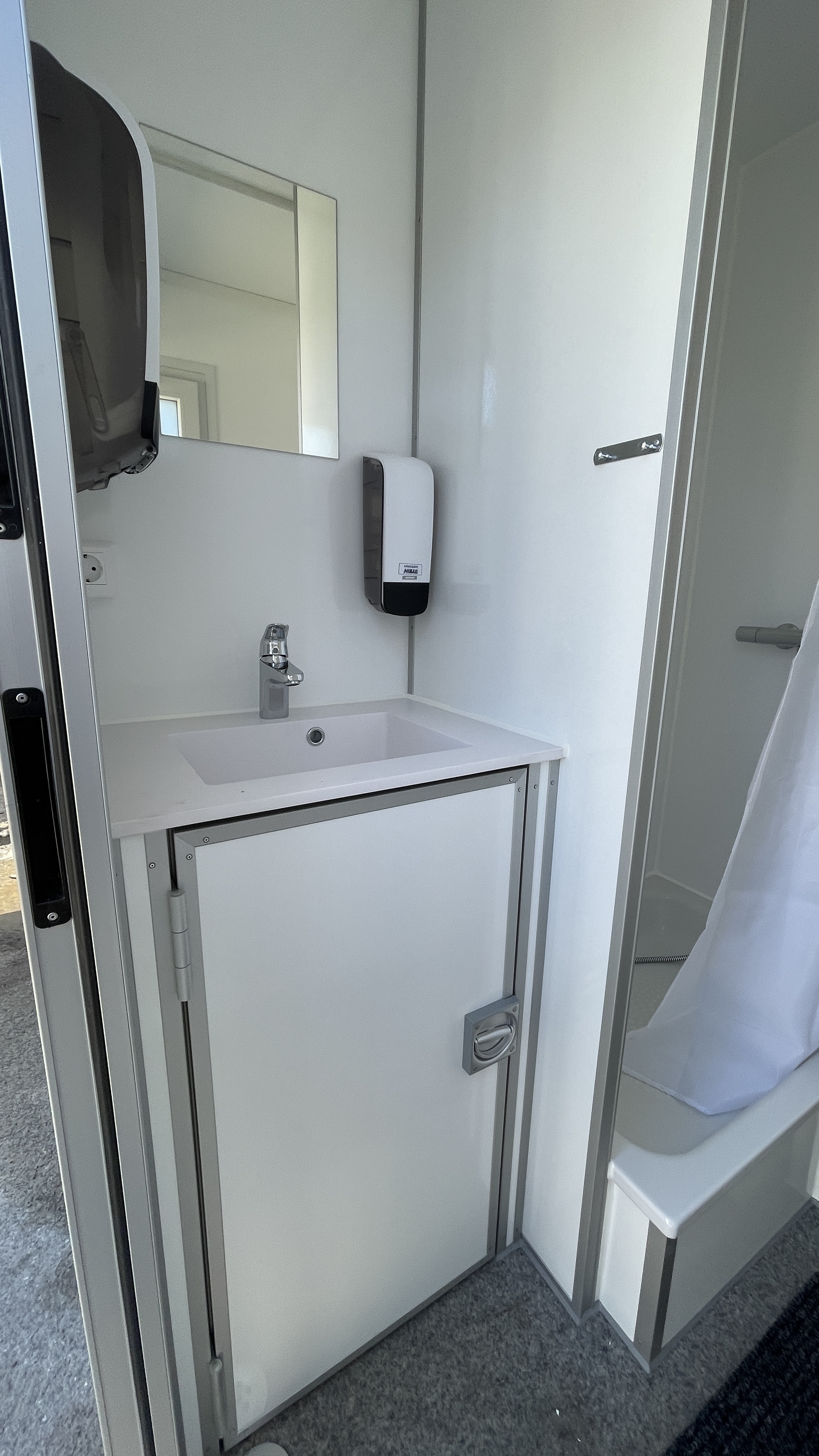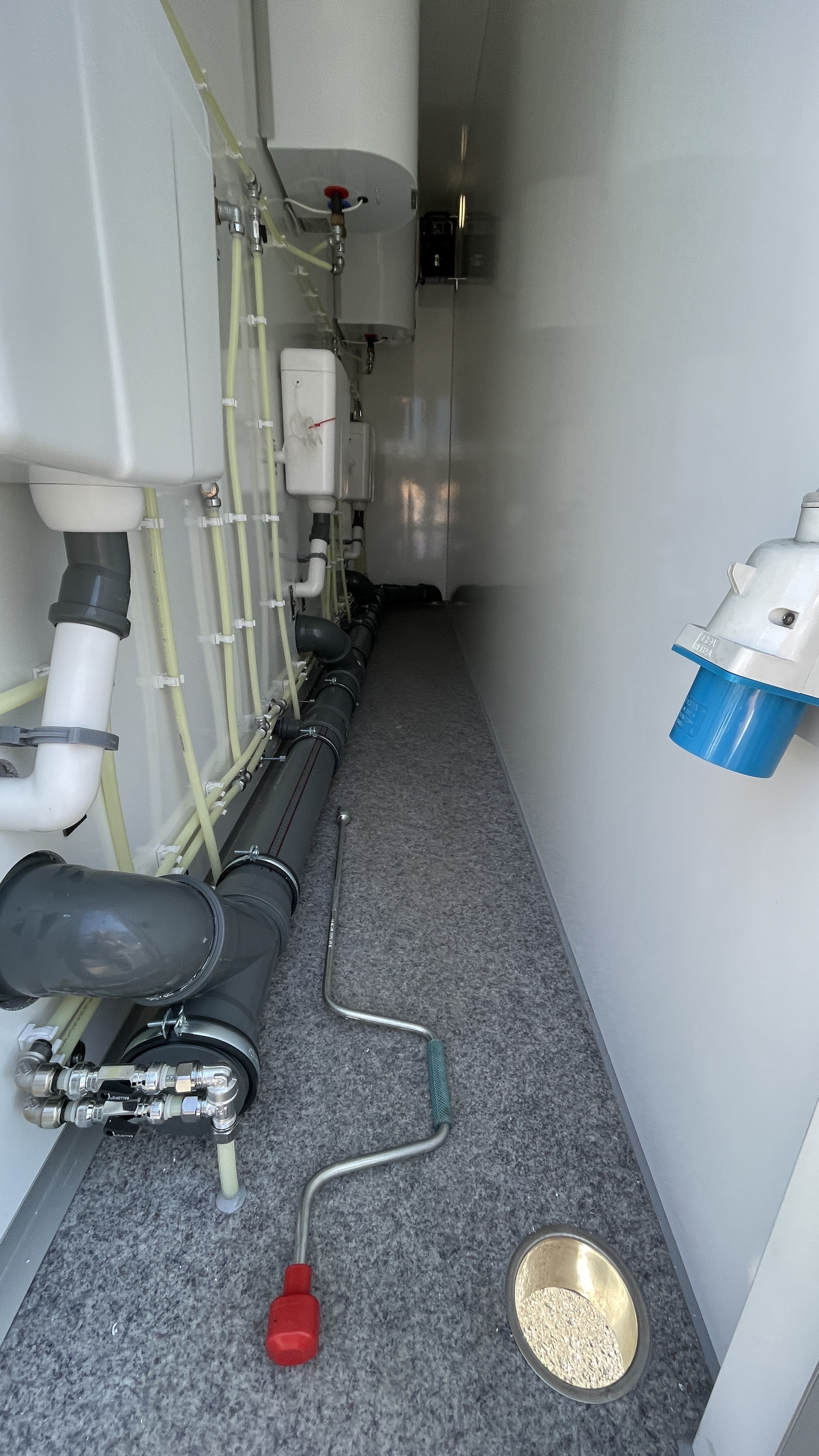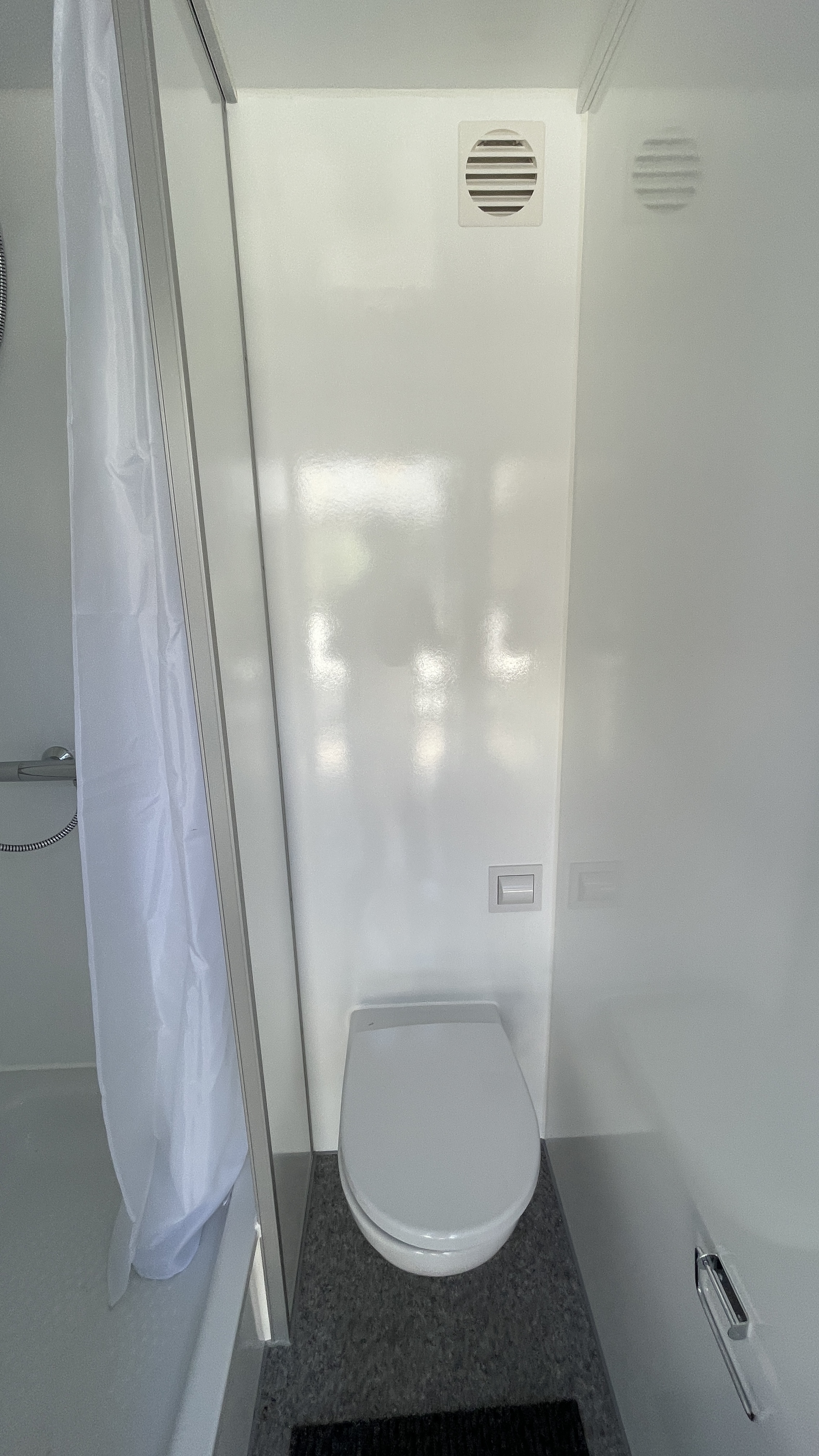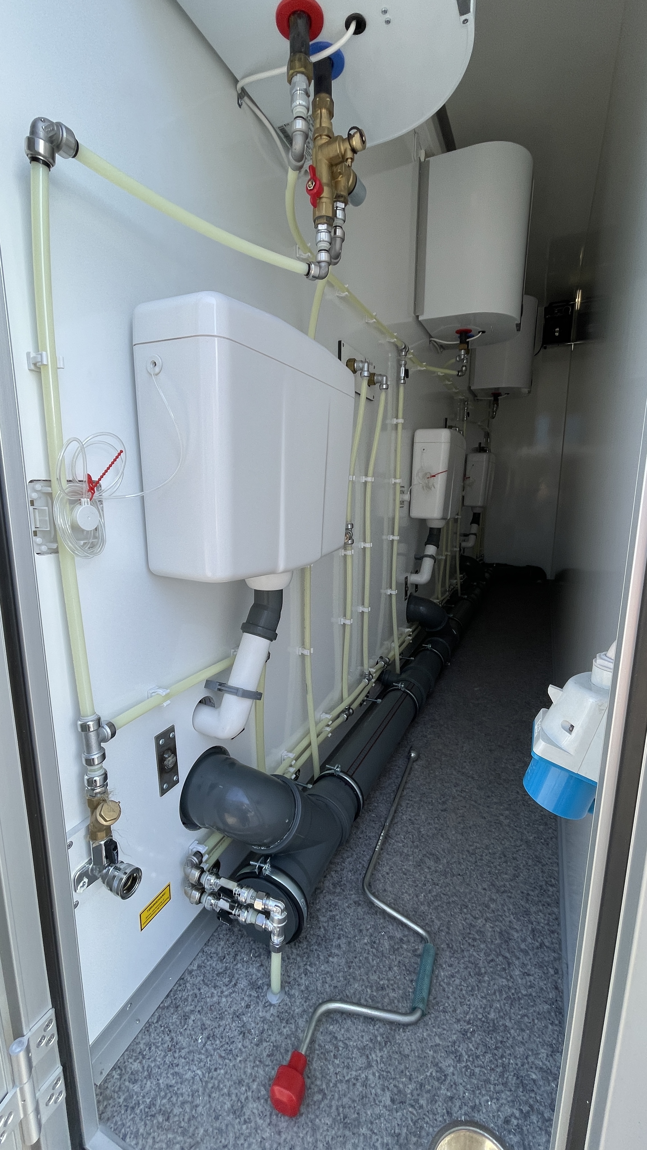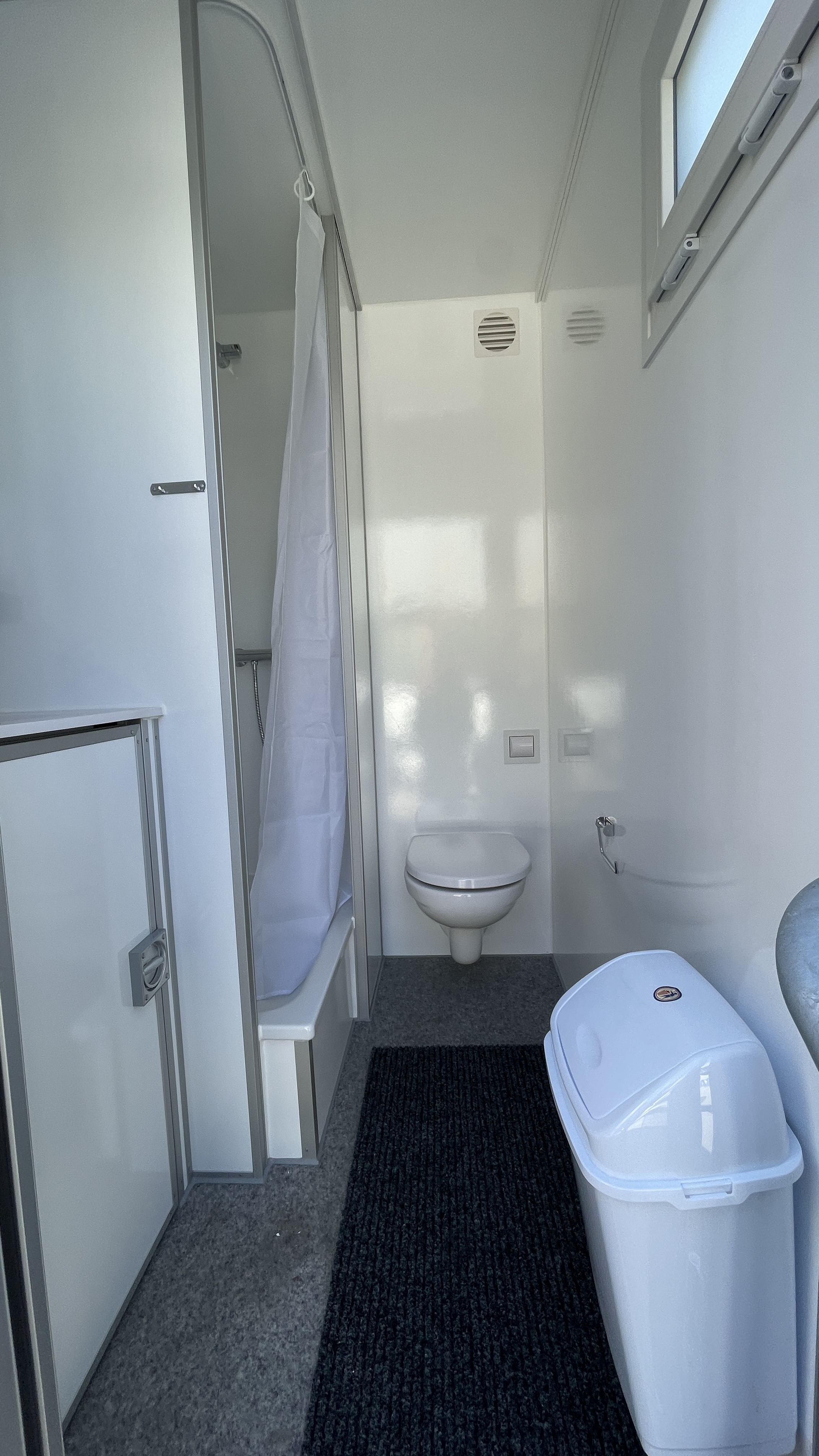 Toalettvogn med 4 separate VIP-tanktoaletter. Montert på hjul for enkel transport. Utstyrt med moderne sanitærfasiliteter.… les mer
