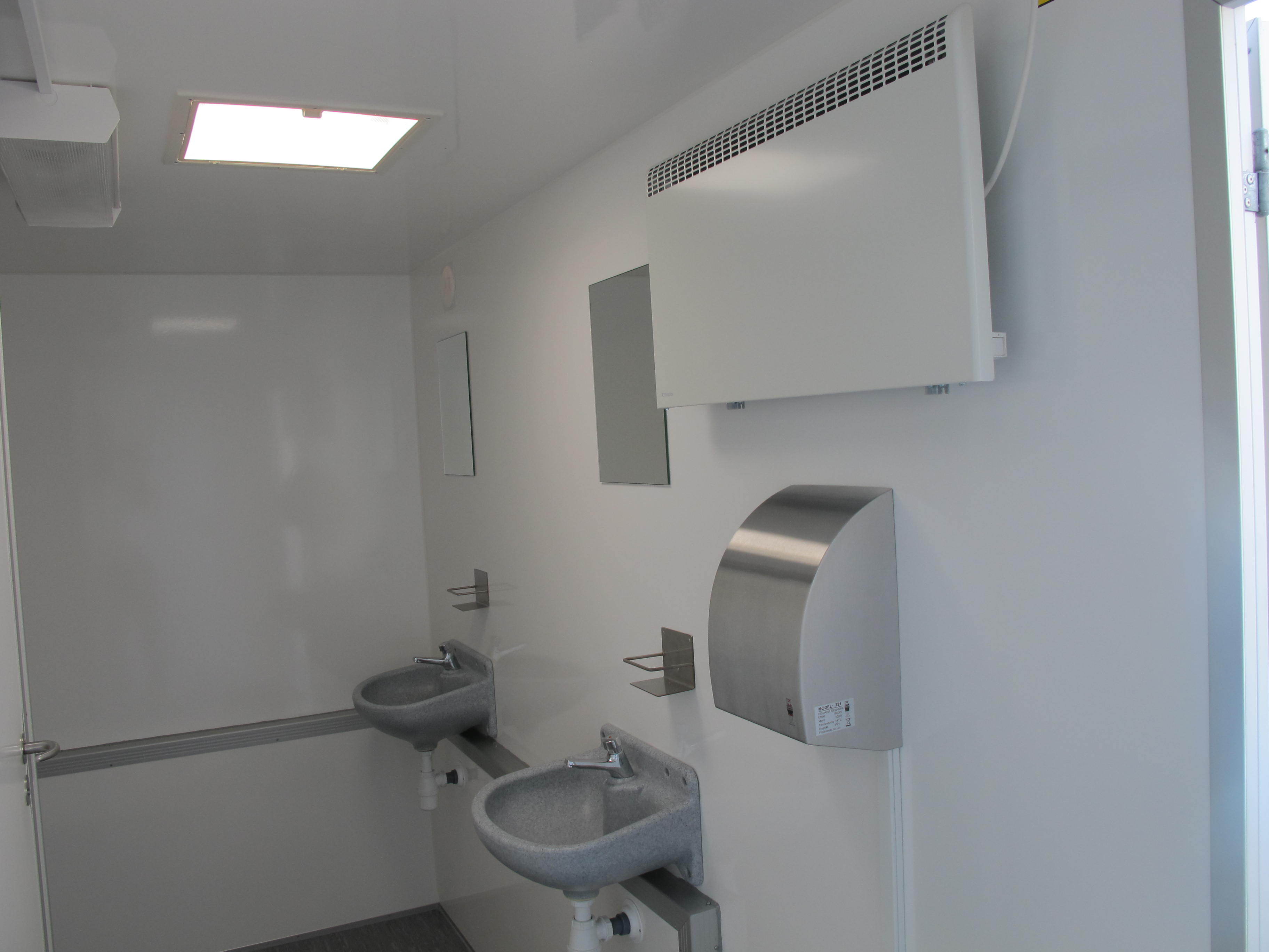 WC-container med 3 standard toaletter og 1 handicaptoalett. Kombinert sanitærløsning med universell utforming. Egnet for… les mer