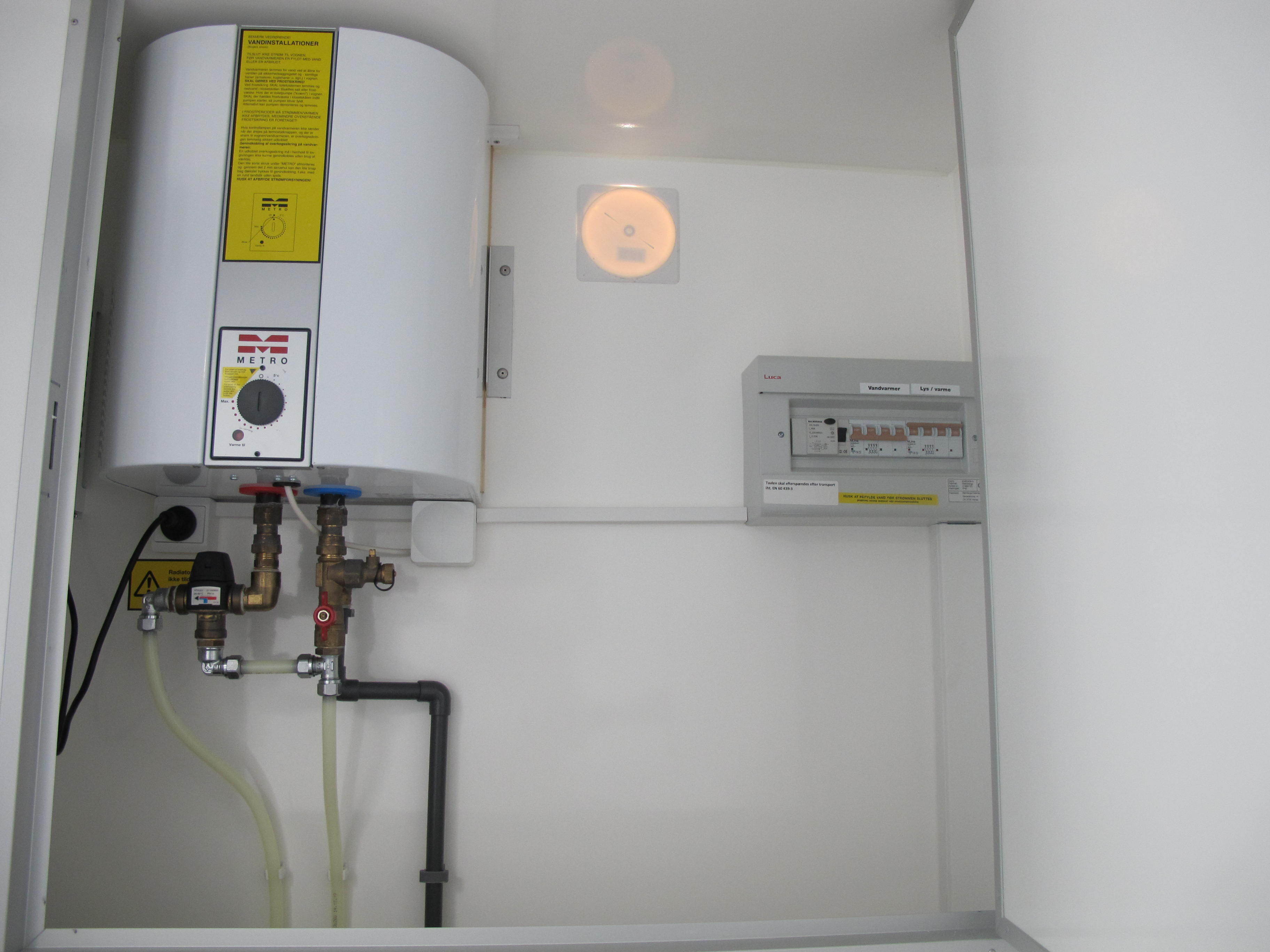 Isolert toalettkabin med integrert toalett og vaskeservant. Utstyrt med lys, varme og strømtilkobling for komfortabel… les mer